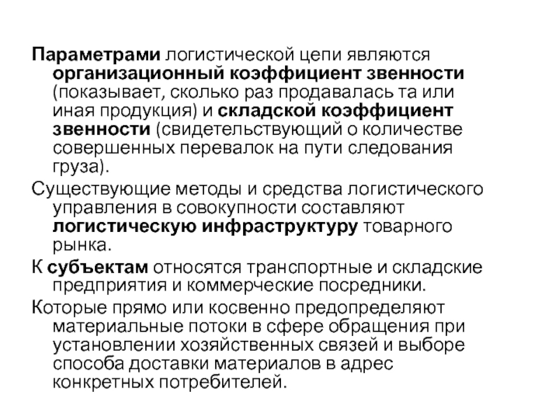 Слайд 16Параметрами логистической цепи являются организационный коэффициент звенности (показывает, сколько раз
