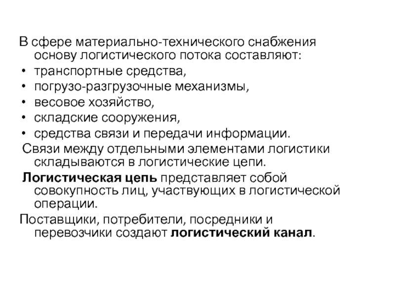 Слайд 15В сфере материально-технического снабжения основу логистического потока составляют: