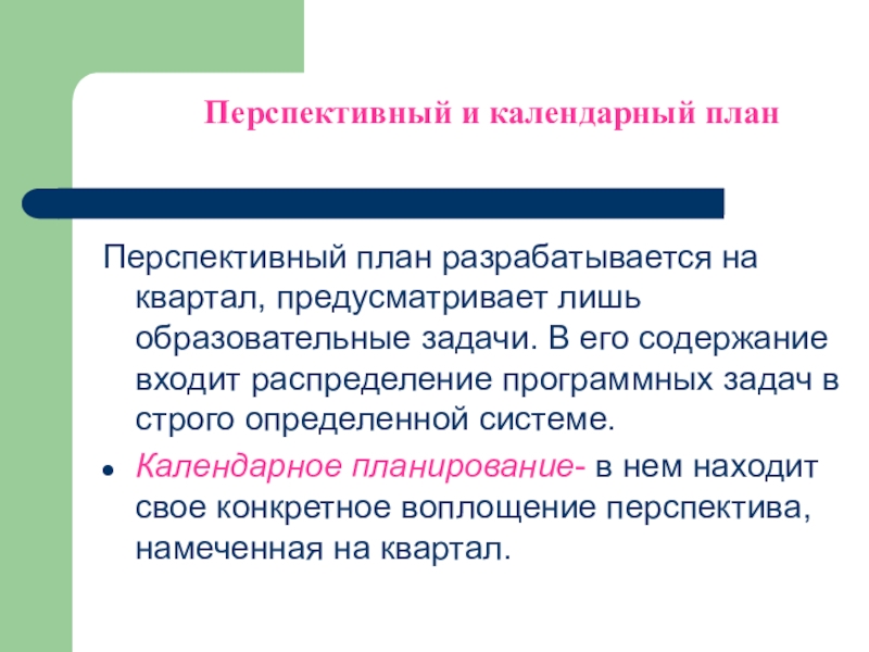 Календарное планирование- в нем находит свое конкретное воплощение перспектива, намеченная на квартал.