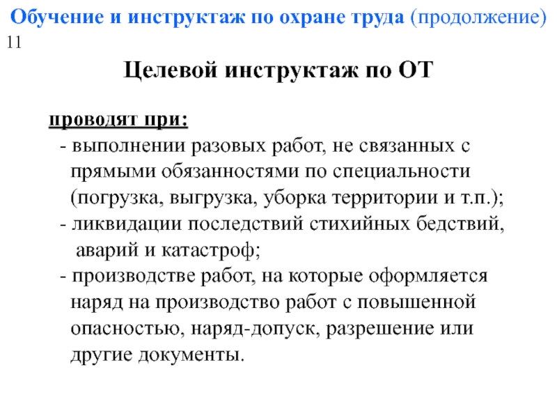 проводят: при изменении технологического процесса; изменении правил по ОТ; внедрении новой техники; нарушении работником требований ТБ, которые привели или могли привести к травме, аварии, взрыву или пожару; при перерывах в работе более 60 дней, а для особо опасных работ - более 30 дней.