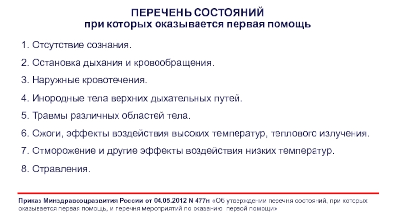 2. Перечень состояний, при которых оказывается первая помощь, и перечень мероприятий по оказанию первой помощи утверждаются уполномоченным федеральным органом исполнительной власти.