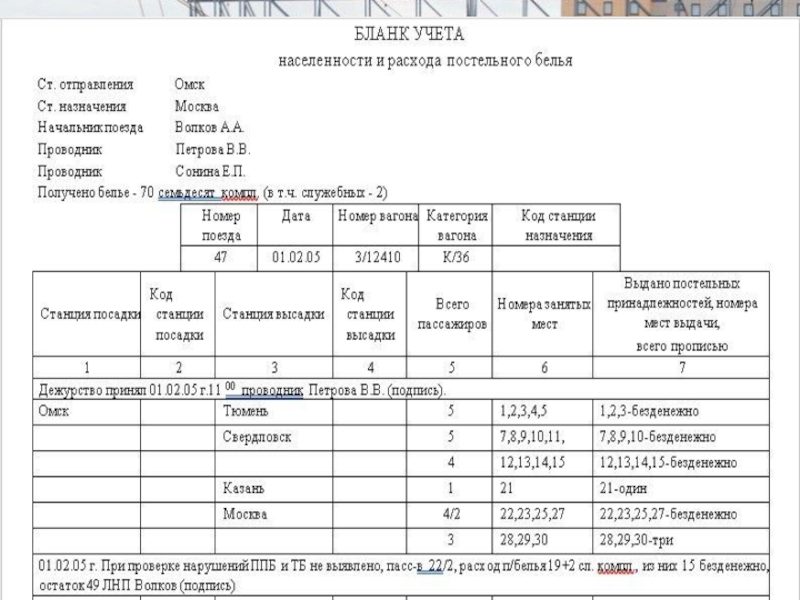 формы ЛУ-72 по одному в каждый вагон. Если в пути следования бланк формы ЛУ-72 закончился, дежурный проводник получает новый бланк, при этом на новом бланке делается отметка «Продолжение бланка №.„», а на заполненном «Продолжение на бланке №...». При утере бланка формы ЛУ-72 проводник должен дать письменное объяснение начальнику поезда (проводник прицепного вагона объяснительную об утере бланка ф. ЛУ-72 должен представить по прибытию вагона в пункт приписки ответственному лицу резерва проводников, у которого он получал бланки перед рейсом) и получить новый бланк, на котором сделать запись «Взамен утерянного бланка № ...».