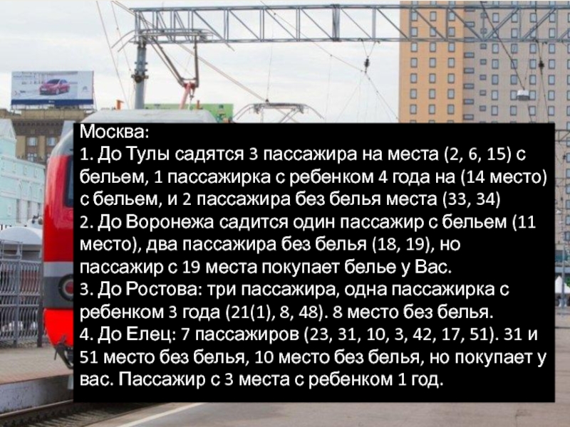 4. До Елец: 7 пассажиров (23, 31, 10, 3, 42, 17, 51). 31 и 51 место без белья, 10 место без белья, но покупает у вас. Пассажир с 3 места с ребенком 1 год.