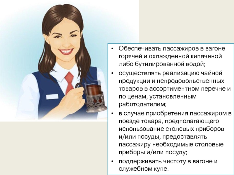 Слайд 11Обеспечивать пассажиров в вагоне горячей и охлажденной кипяченой либо бутилированной