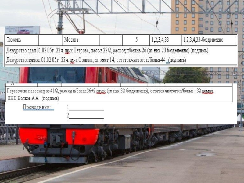бланк ЛУ-72 , квитанции за пользование постельным бельем ВУ-9, ведомости занятия мест пассажирами, контрольные купоны проездных документов, деньги за реализованную чайную, печатную и другую продукцию, постельное белье, акты, составленные в пути следования;