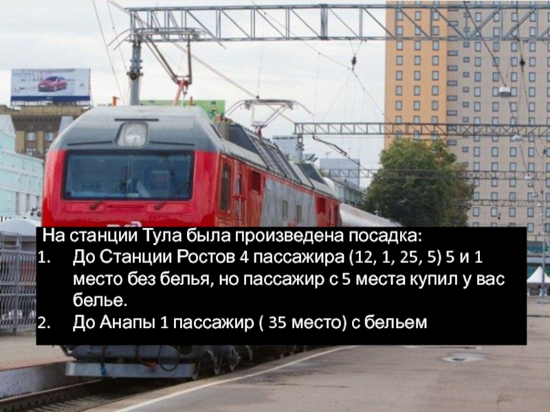 1. До Тулы садятся 3 пассажира на места (2, 6,