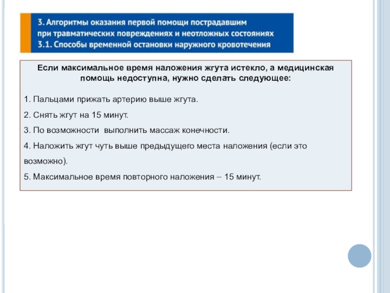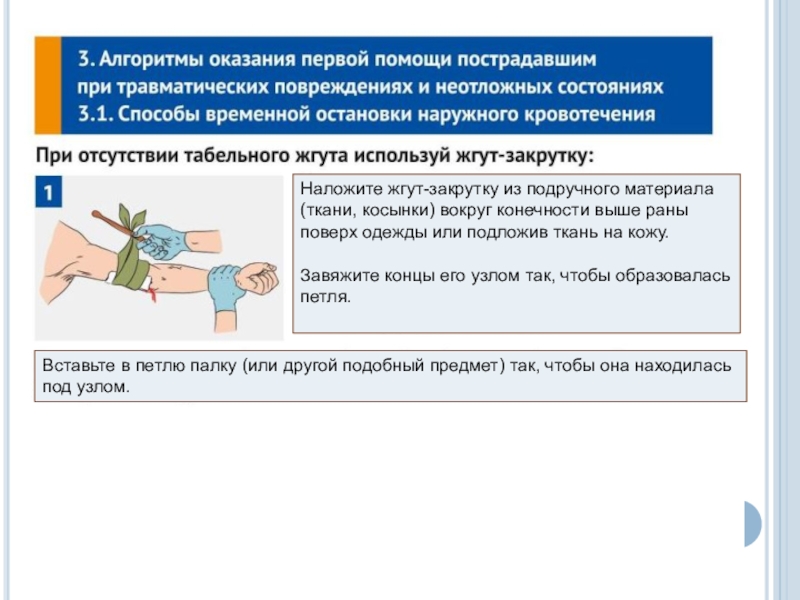 До наложения жгута не отпускать прижатую артерию, чтобы не возобновилось кровотечение.