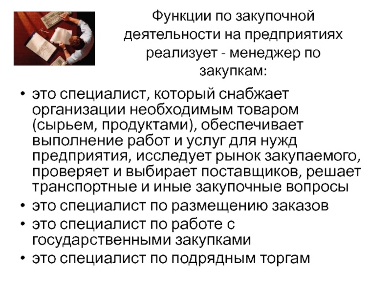 Слайд 8Функции по закупочной деятельности на предприятиях реализует - менеджер по