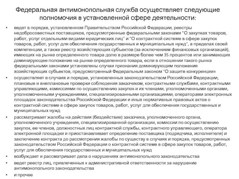 Слайд 54Федеральная антимонопольная служба осуществляет следующие полномочия в установленной сфере деятельности: