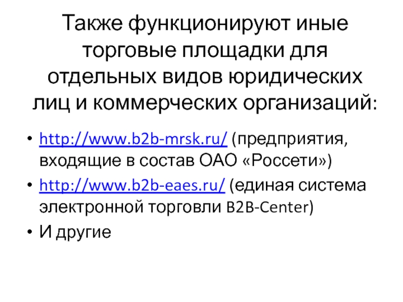 Слайд 27Также функционируют иные торговые площадки для отдельных видов юридических лиц