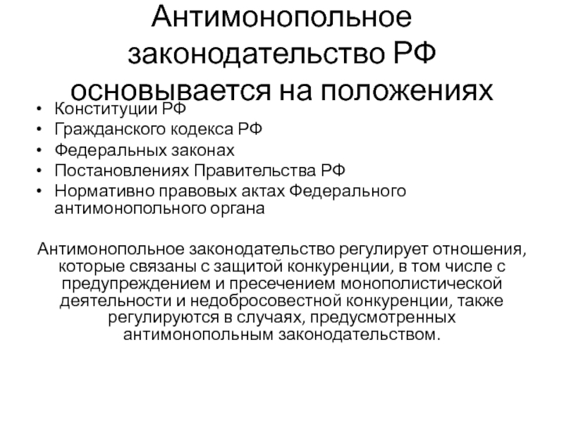 Слайд 51Антимонопольное законодательство РФ основывается на положениях
