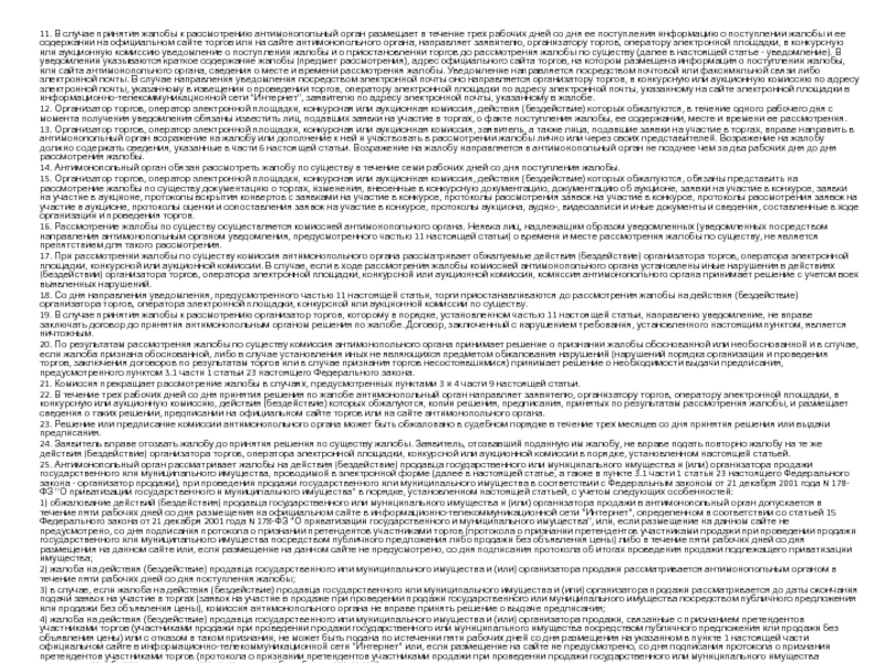 18. Со дня направления уведомления, предусмотренного частью 11 настоящей статьи, торги приостанавливаются до рассмотрения жалобы на действия (бездействие) организатора торгов, оператора электронной площадки, конкурсной или аукционной комиссии по существу.