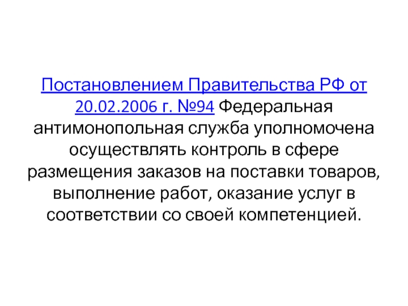 Слайд 52Постановлением Правительства РФ от 20.02.2006 г. №94 Федеральная антимонопольная служба
