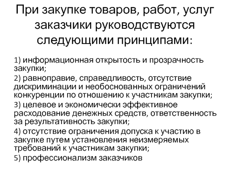 Слайд 11При закупке товаров, работ, услуг заказчики руководствуются следующими принципами: