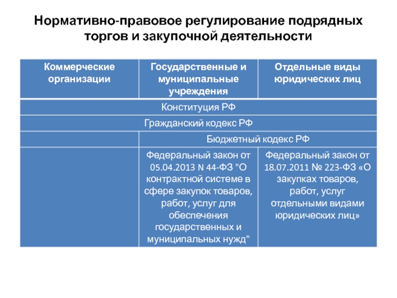 Слайд 7Нормативно-правовое регулирование подрядных торгов и закупочной деятельности
