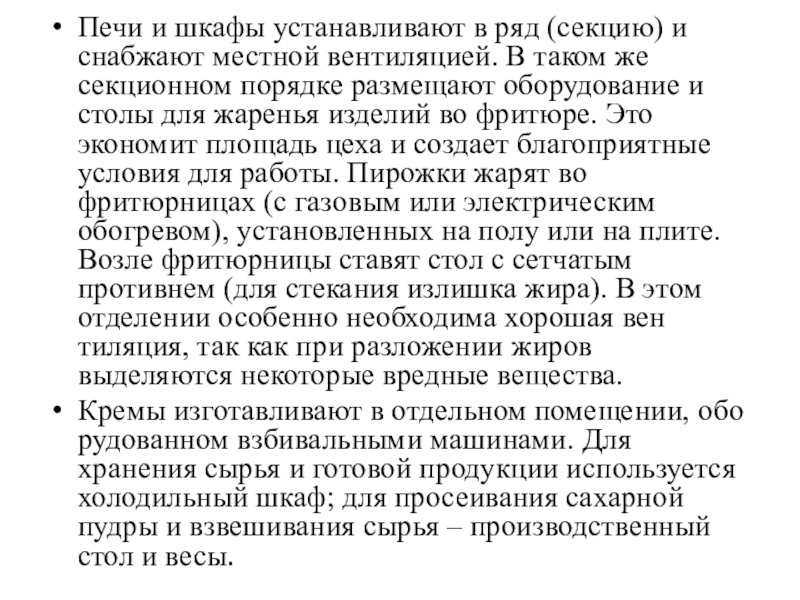 для жаренья изделий во фритюре. Это экономит площадь цеха и создает благоприятные условия для работы. Пирожки жарят во фритюрницах (с газовым или электрическим обогревом), установленных на полу или на плите. Возле фритюрницы ставят стол с сетчатым противнем (для стекания излишка жира). В этом отделении особенно необходима хорошая вентиляция, так как при разложении жиров выделяются некоторые вредные вещества.