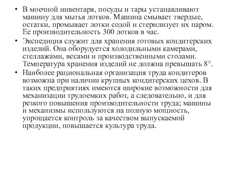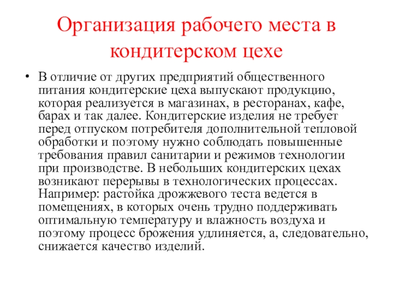 в ресторанах, кафе, барах и так далее. Кондитерские изделия не требует перед отпуском потребителя дополнительной тепловой обработки и поэтому нужно соблюдать повышенные требования правил санитарии и режимов технологии при производстве. В небольших кондитерских цехах возникают перерывы в технологических процессах. Например: растойка дрожжевого теста ведется в помещениях, в которых очень трудно поддерживать оптимальную температуру и влажность воздуха и поэтому процесс брожения удлиняется, а, следовательно, снижается качество изделий.