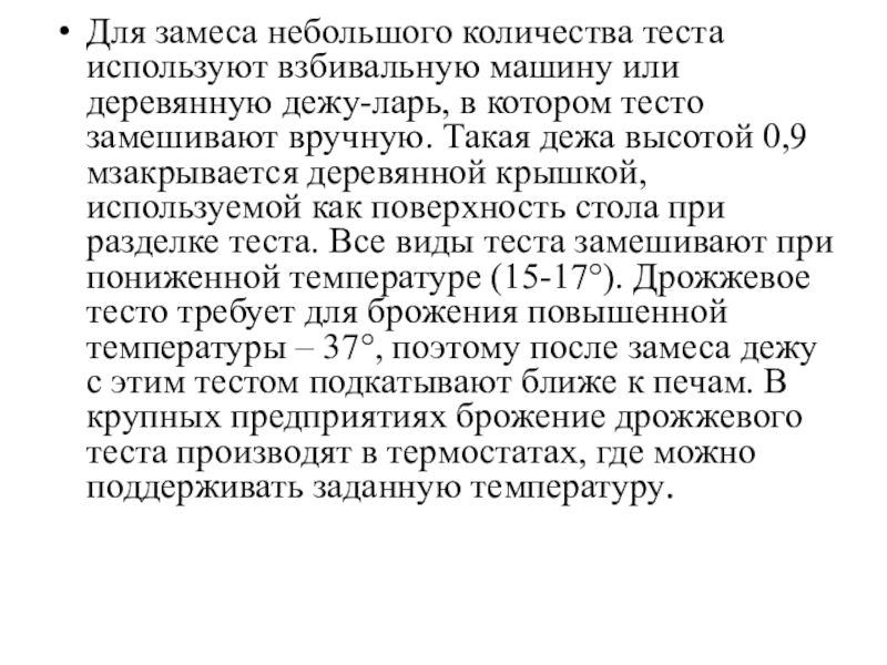 мзакрывается деревянной крышкой, используемой как поверхность стола при разделке теста. Все виды теста замешивают при пониженной температуре (15-17°). Дрожжевое тесто требует для брожения повышенной температуры – 37°, поэтому после замеса дежу с этим тестом подкатывают ближе к печам. В крупных предприятиях брожение дрожжевого теста производят в термостатах, где можно поддерживать заданную температуру.