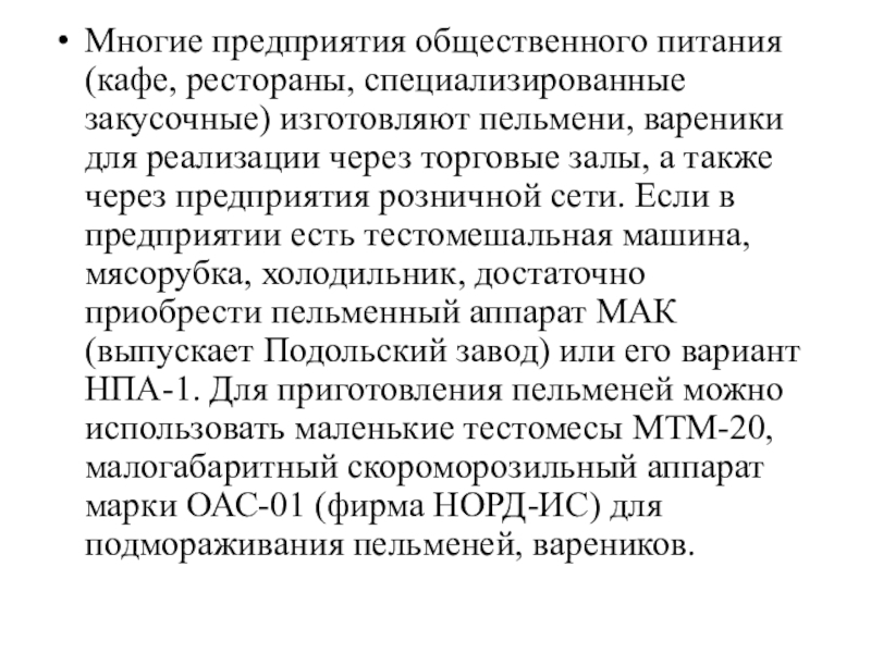 Слайд 16Многие предприятия общественного питания (кафе, рестораны, специализированные закусочные) изготовляют пельмени,