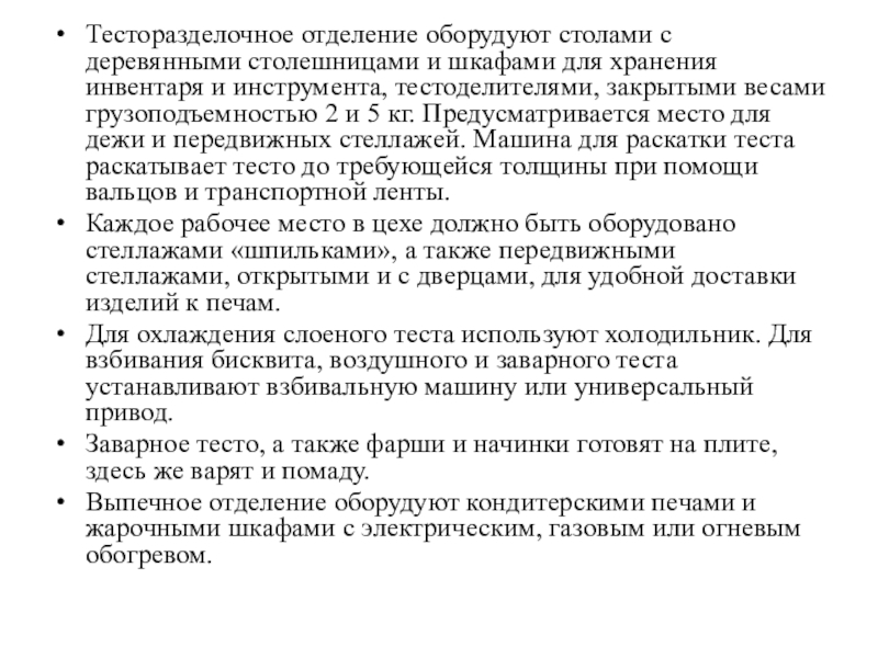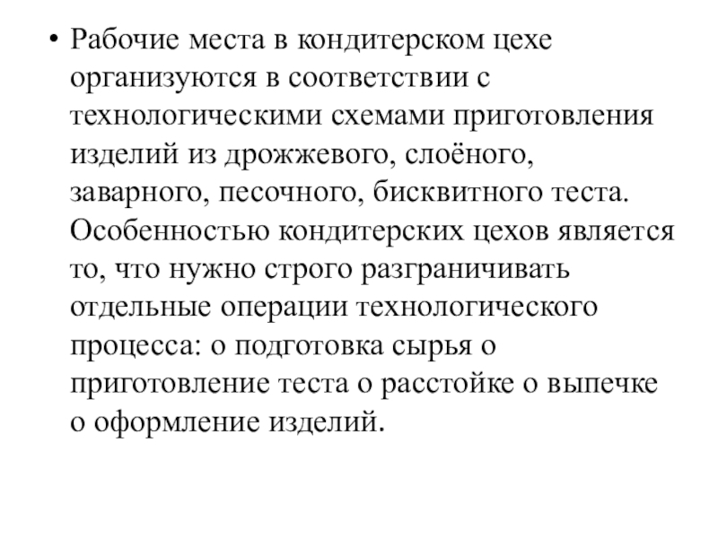 Особенностью кондитерских цехов является то, что нужно строго разграничивать отдельные операции технологического процесса: o подготовка сырья o приготовление теста o расстойке o выпечке o оформление изделий.