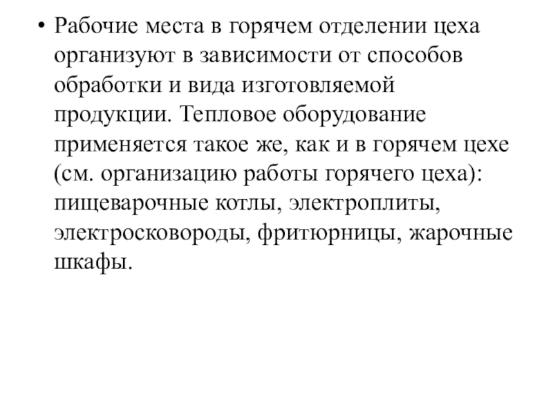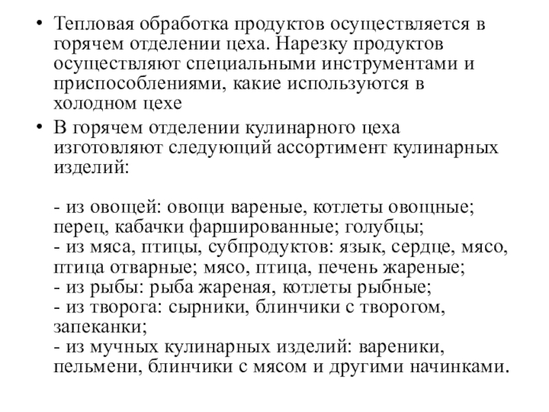 Слайд 10Тепловая обработка продуктов осуществляется в горячем отделении цеха. Нарезку продуктов
