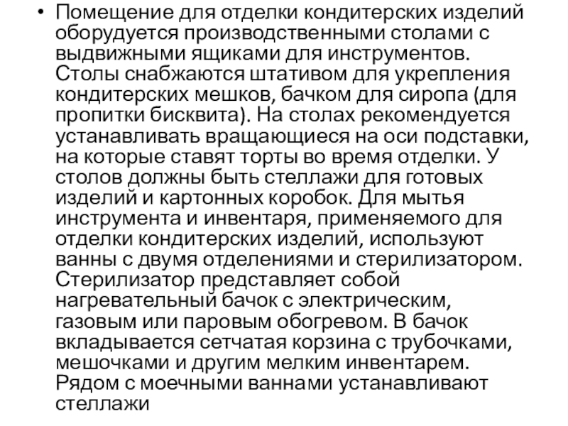 Слайд 35Помещение для отделки кондитерских изделий оборудуется производственными столами с выдвижными