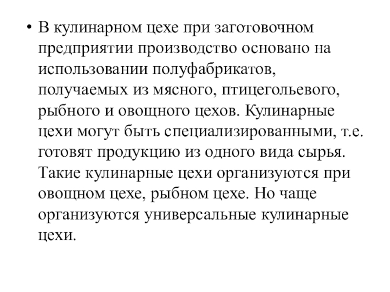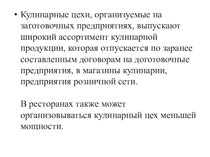 Слайд 2Кулинарные цехи, организуемые на заготовочных предприятиях, выпускают широкий ассортимент кулинарной