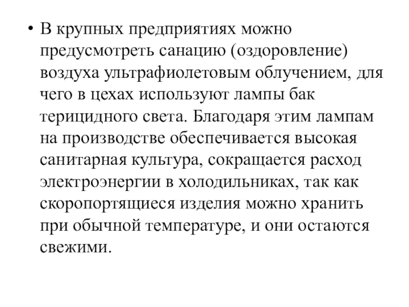 Слайд 38В крупных предприятиях можно предусмотреть санацию (оздоровление) воздуха ультрафиолетовым облучением,