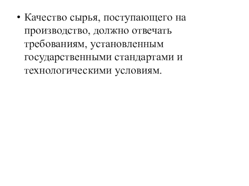 Слайд 30Качество сырья, поступающего на производство, должно отвечать требованиям, установленным государственными