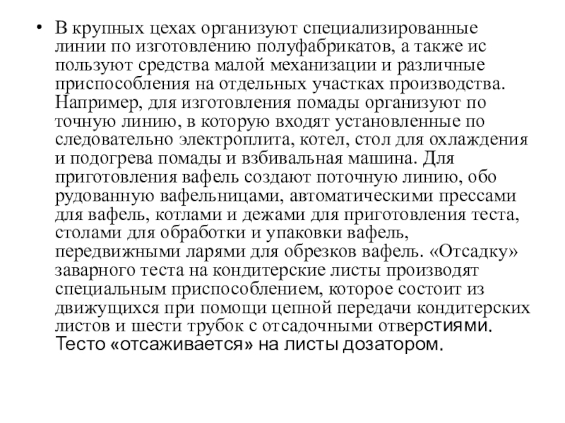 участках производства. Например, для изготовления помады организуют поточную линию, в которую входят установленные последовательно электроплита, котел, стол для охлаждения и подогрева помады и взбивальная машина. Для приготовления вафель создают поточную линию, оборудованную вафельницами, автоматическими прессами для вафель, котлами и дежами для приготовления теста, столами для обработки и упаковки вафель, передвижными ларями для обрезков вафель. «Отсадку» заварного теста на кондитерские листы производят специальным приспособлением, которое состоит из движущихся при помощи цепной передачи кондитерских листов и шести трубок с отсадочными отверстиями. Тесто «отсаживается» на листы дозатором.