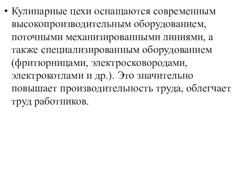 Слайд 7Кулинарные цехи оснащаются современным высокопроизводительным оборудованием, поточными механизированными линиями, а