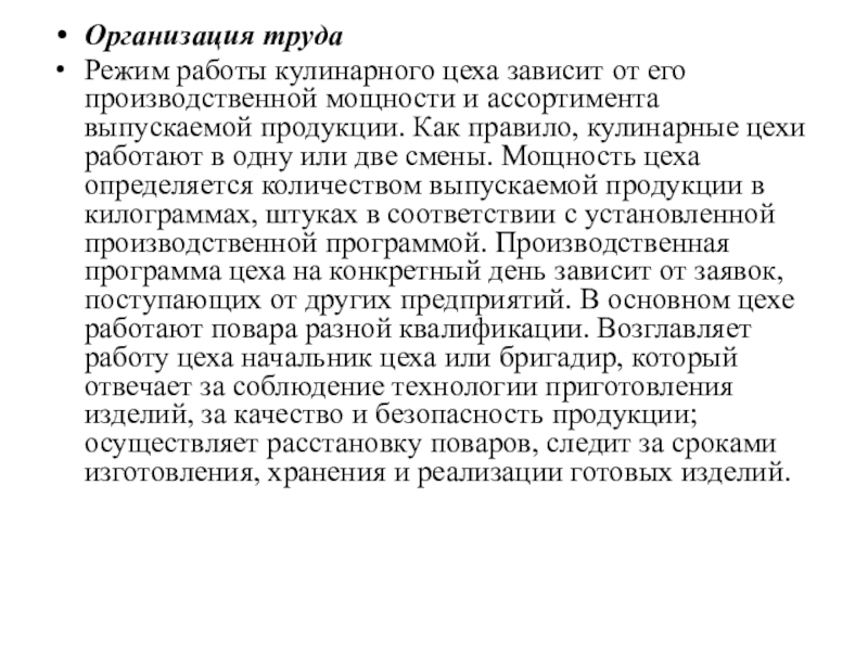 одну или две смены. Мощность цеха определяется количеством выпускаемой продукции в килограммах, штуках в соответствии с установленной производственной программой. Производственная программа цеха на конкретный день зависит от заявок, поступающих от других предприятий. В основном цехе работают повара разной квалификации. Возглавляет работу цеха начальник цеха или бригадир, который отвечает за соблюдение технологии приготовления изделий, за качество и безопасность продукции; осуществляет расстановку поваров, следит за сроками изготовления, хранения и реализации готовых изделий.