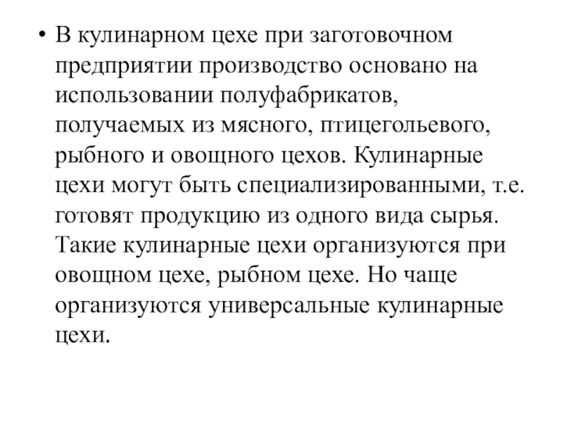 Слайд 6В кулинарном цехе при заготовочном предприятии производство основано на использовании