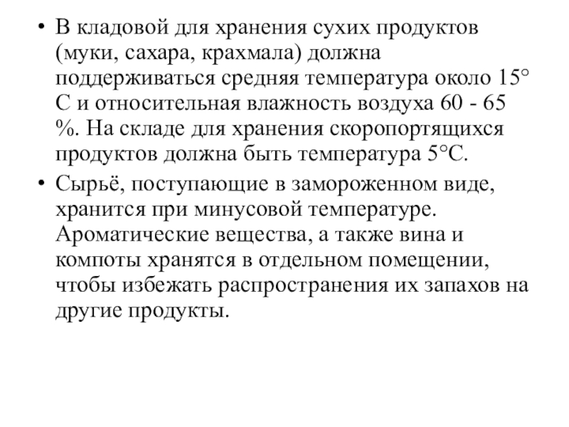 Сырьё, поступающие в замороженном виде, хранится при минусовой температуре. Ароматические вещества, а также вина и компоты хранятся в отдельном помещении, чтобы избежать распространения их запахов на другие продукты.