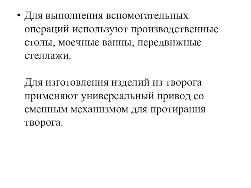 Слайд 14Для выполнения вспомогательных операций используют производственные столы, моечные ванны, передвижные