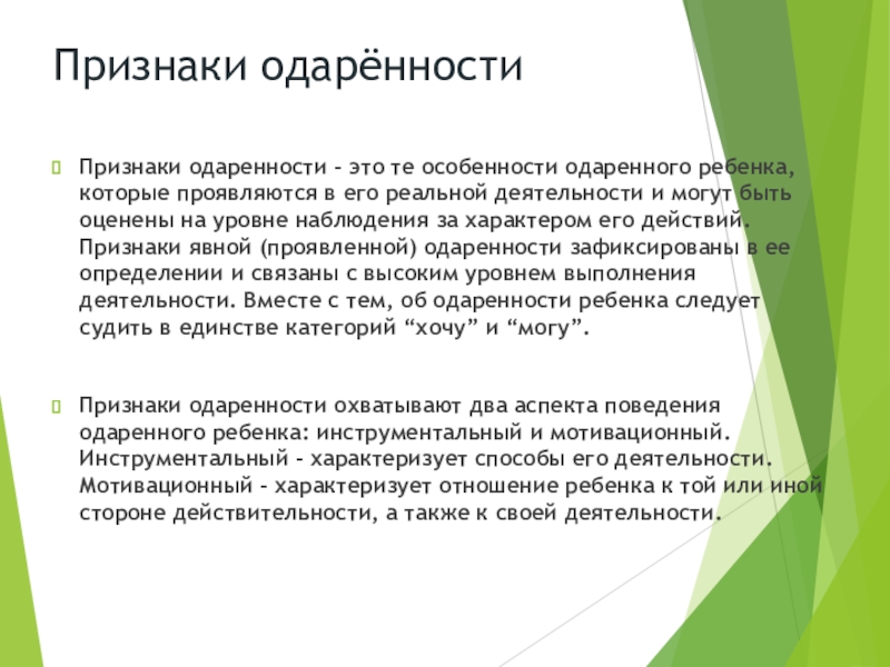 Признаки одаренности охватывают два аспекта поведения одаренного ребенка: инструментальный и мотивационный. Инструментальный - характеризует способы его деятельности. Мотивационный - характеризует отношение ребенка к той или иной стороне действительности, а также к своей деятельности.