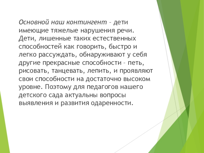 Слайд 5Основной наш контингент – дети имеющие тяжелые нарушения речи. Дети,