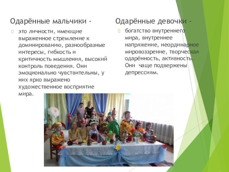 не испытывают проблем в обучении, лучше общаются со сверстниками, быстрее адаптируются к новой обстановке. Их интересы и склонности, развитые уже с детства, служат хорошей основой для успешного личностного и профессионального самоопределения. Правда, и у этих детей могут возникать проблемы в том случае, если не учитываются их повышенные возможности: обучение становится слишком легким или же нет условий для развития их творческого потенциала.