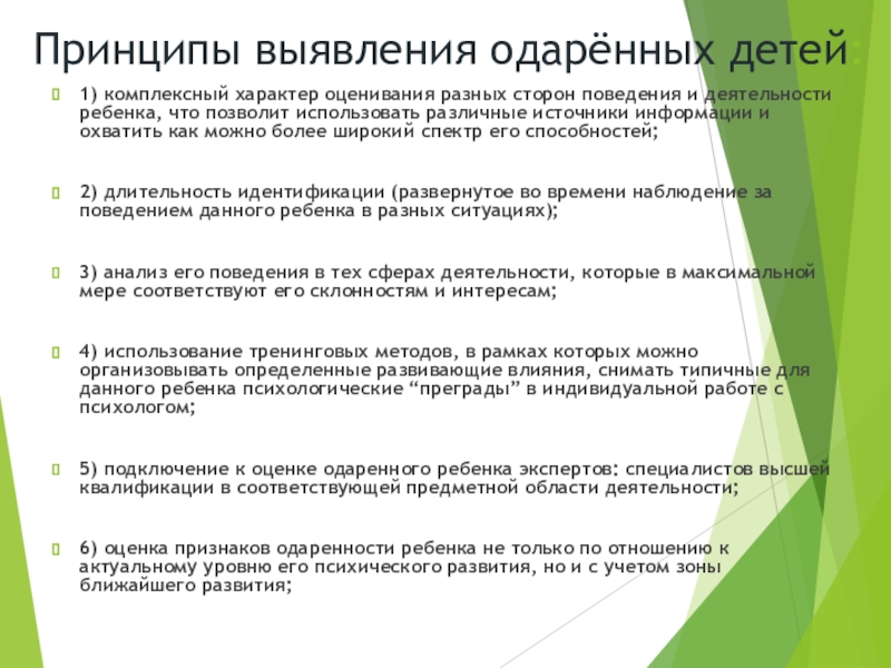 6) оценка признаков одаренности ребенка не только по отношению к актуальному уровню его психического развития, но и с учетом зоны ближайшего развития;