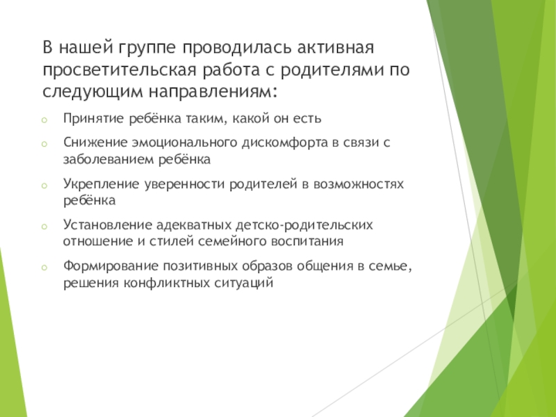Слайд 16В нашей группе проводилась активная просветительская работа с родителями по