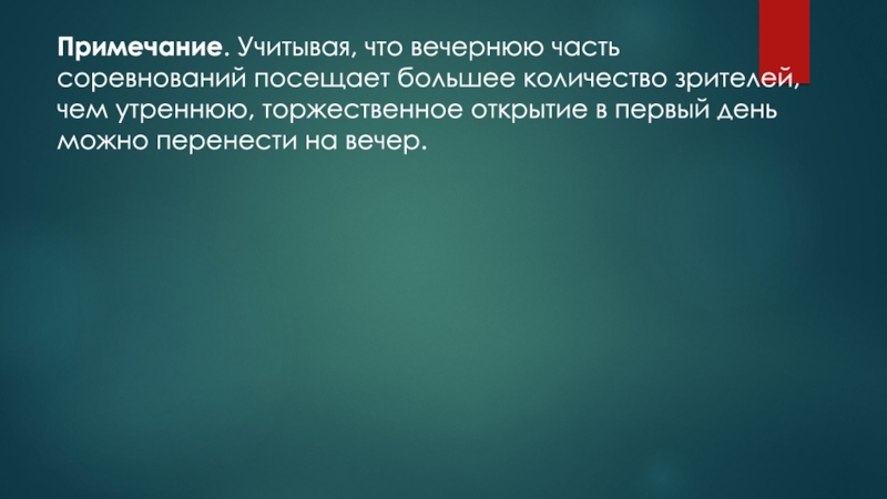 Слайд 9Примечание. Учитывая, что вечернюю часть соревнований посещает большее количество зрителей,