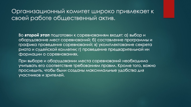 Организационный комитет широко привлекает к своей рабо­те общественный актив.Во второй этап подготовки к соревнованиям входят: а) выбор и оборудование