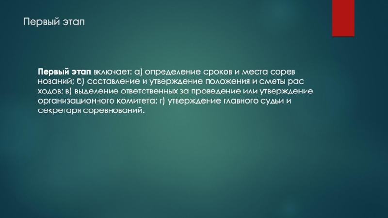 Первый этап включает: а) определение сроков и места сорев­нований; б)