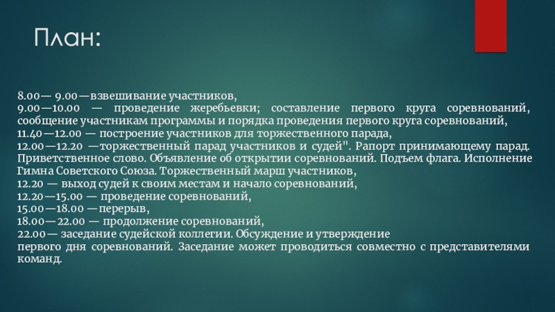 План:8.00— 9.00—взвешивание участников,9.00—10.00 — проведение жеребьевки; составление первого круга соревнова­ний, сообщение участникам программы и порядка проведения первого