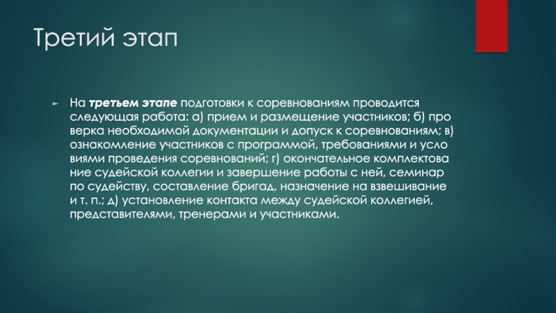 Третий этапНа третьем этапе подготовки к соревнованиям проводится следующая работа: а) прием и размещение участников; б) про­верка необходимой документации