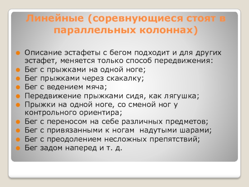 Слайд 5Линейные (соревнующиеся стоят в параллельных колоннах)
