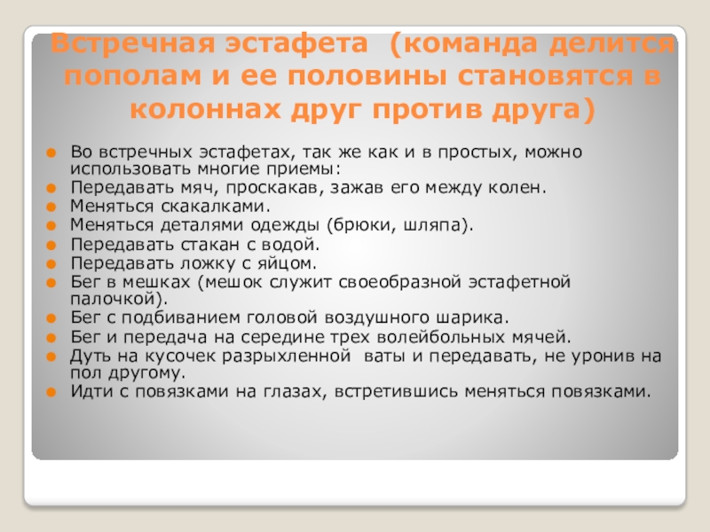 Слайд 6Встречная эстафета (команда делится пополам и ее половины становятся в