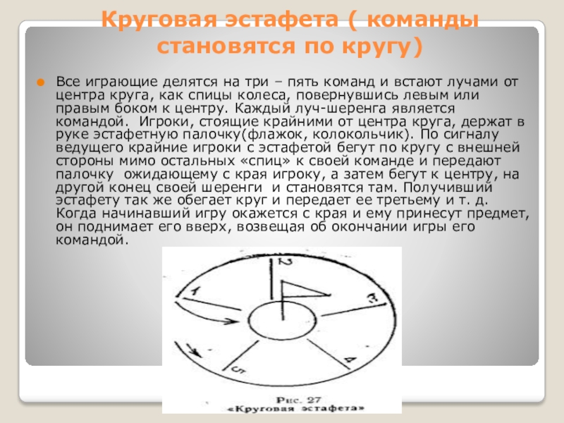 как спицы колеса, повернувшись левым или правым боком к центру. Каждый луч-шеренга является командой. Игроки, стоящие крайними от центра круга, держат в руке эстафетную палочку(флажок, колокольчик). По сигналу ведущего крайние игроки с эстафетой бегут по кругу с внешней стороны мимо остальных «спиц» к своей команде и передают палочку ожидающему с края игроку, а затем бегут к центру, на другой конец своей шеренги и становятся там. Получивший эстафету так же обегает круг и передает ее третьему и т. д. Когда начинавший игру окажется с края и ему принесут предмет, он поднимает его вверх, возвещая об окончании игры его командой.