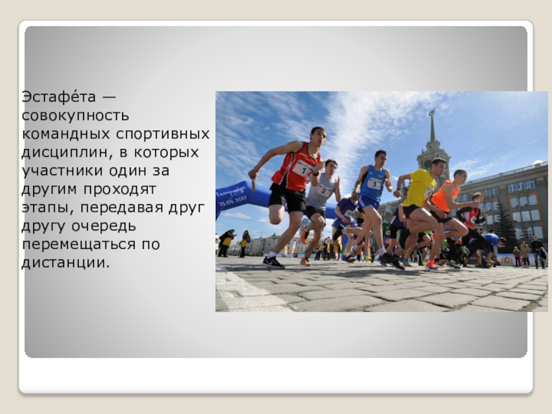 Слайд 2Эстафе́та — совокупность командных спортивных дисциплин, в которых участники один