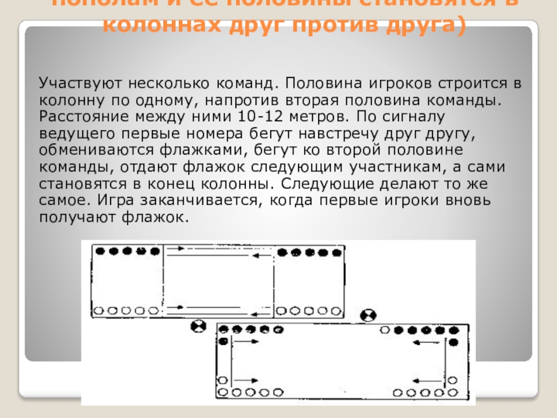 колонну по одному, напротив вторая половина команды. Расстояние между ними 10-12 метров. По сигналу ведущего первые номера бегут навстречу друг другу, обмениваются флажками, бегут ко второй половине команды, отдают флажок следующим участникам, а сами становятся в конец колонны. Следующие делают то же самое. Игра заканчивается, когда первые игроки вновь получают флажок.